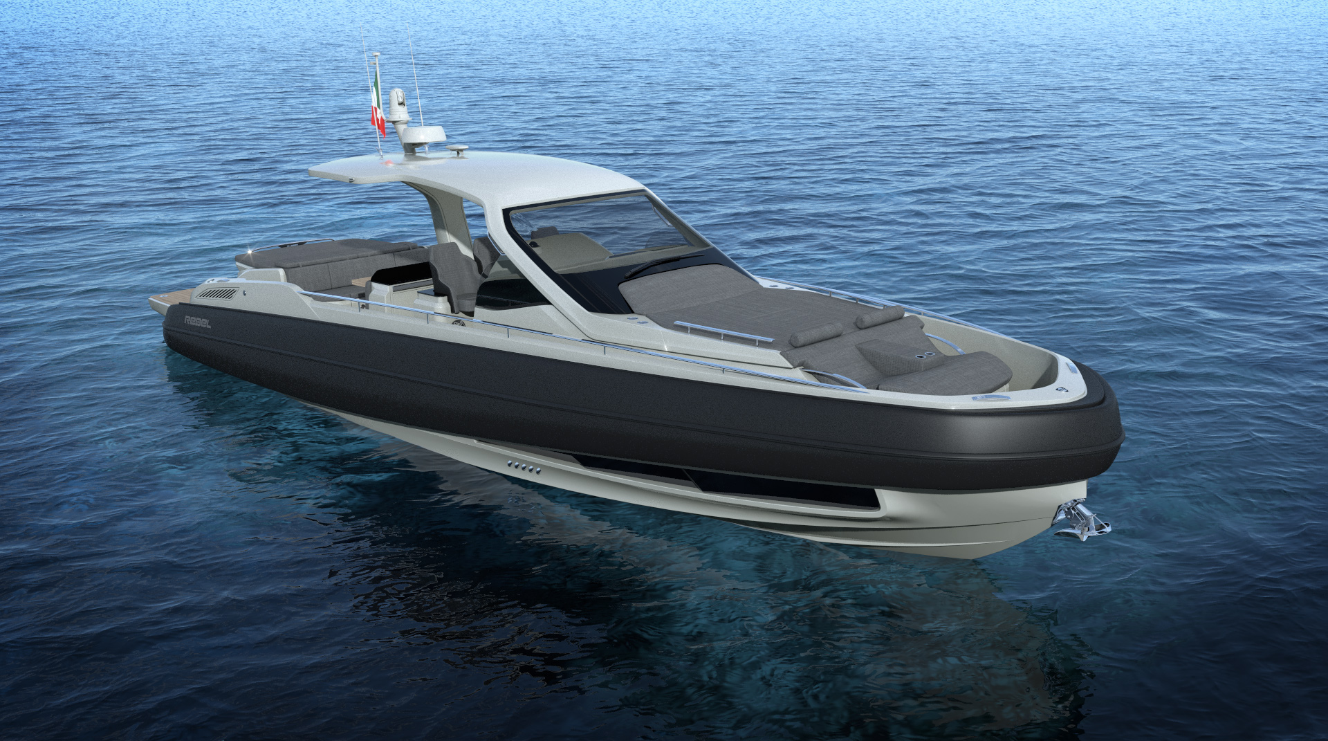 - Hull and deck in white gelcoat RAL 9016, console, bow nose bar top, and optional Sport Top painted in Silver F426