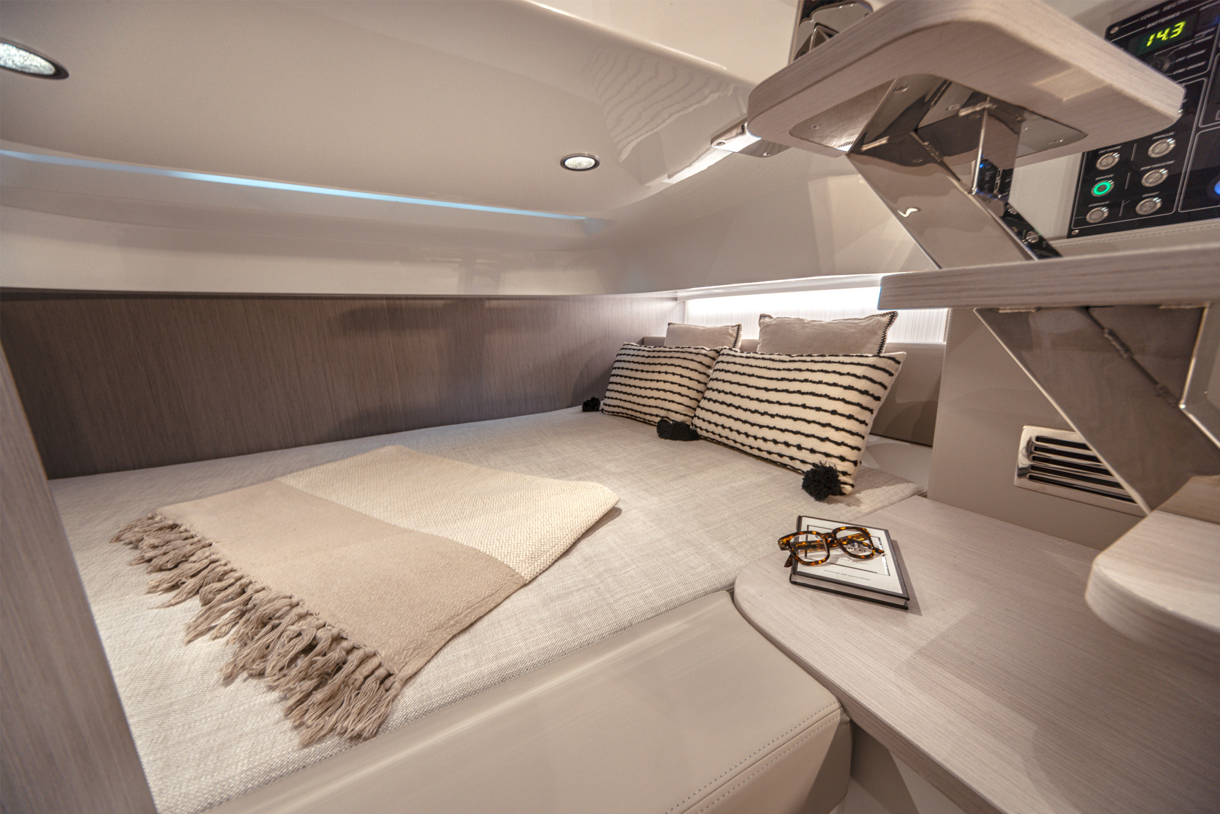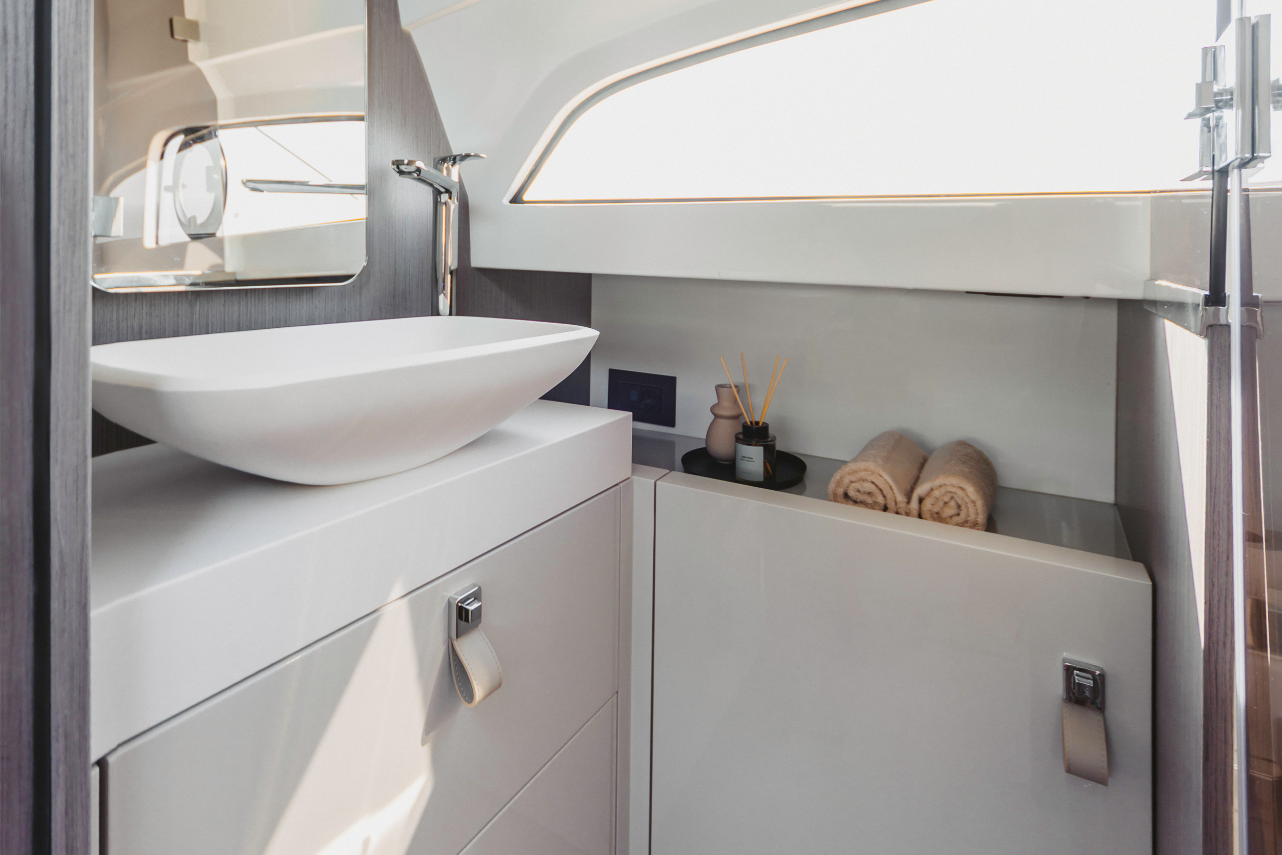 The new hull and its lines convey a sense of strength and safety. The spacious exterior areas are perfect for socializing and relaxing. Below deck, the generous layout offers two cabins and a bathroom with a separate shower, ensuring maximum comfort and superior accommodations within its class.